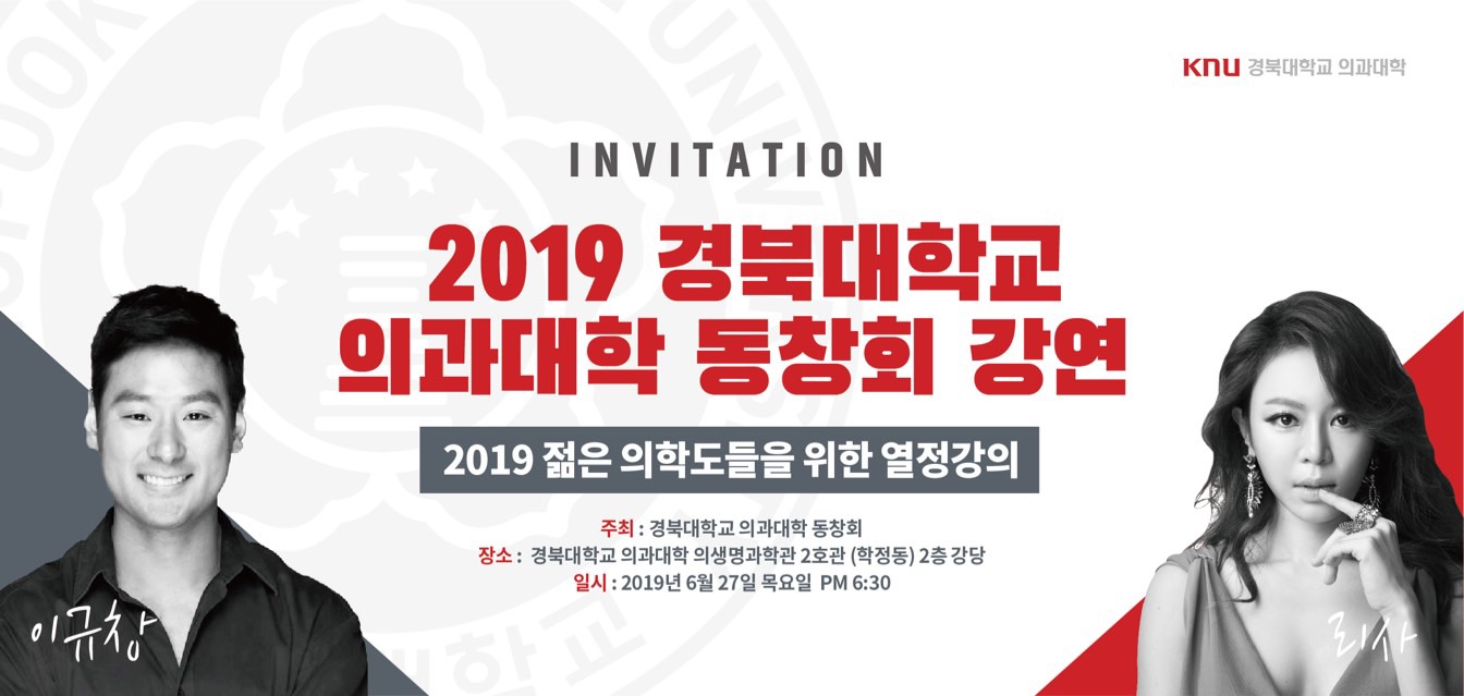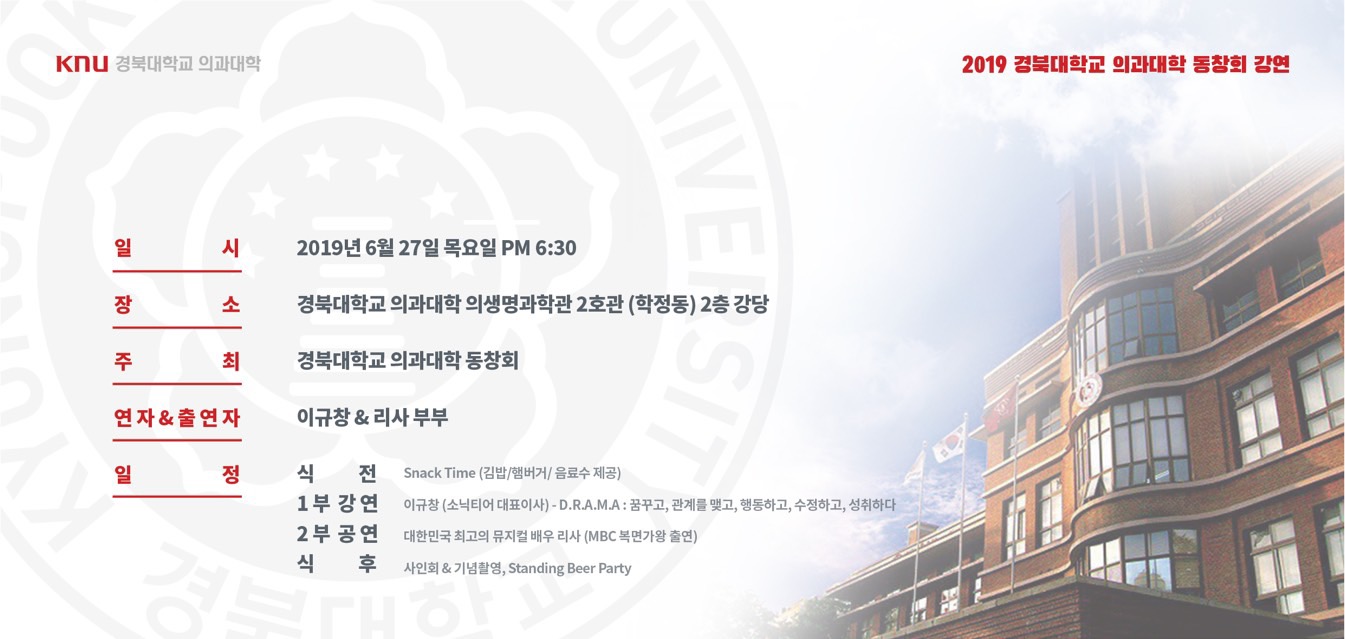 ÀϽà : 2019³â 06¿ù 27ÀÏ ¸ñ¿äÀÏ PM 06:30 Àå¼Ò : °æºÏ´ëÇб³ Àǰú´ëÇÐ ÀÇ»ý¸í°úÇаü 2È£°ü (ÇÐÁ¤µ¿) 2Ãþ °´ç ÁÖÃÖ : °æºÏ´ëÇб³ Àǰú´ëÇÐ µ¿Ã¢È¸ ¿¬ÀÚ & Ã⿬ÀÚ : À̱Ôâ & ¸®»ç ºÎºÎ